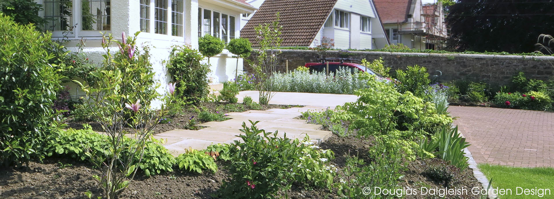 The recent addition of a cleverly-designed south-facing Garden Room gave this notable Arts & Crafts villa a delightful new living space, particularly lovely when suffused with morning light. I designed a new sandstone patio with two flights of steps to link the new garden room via the new patio to the realigned driveway. The planting is designed to integrate and shelter the elevated patio within the surrounding garden.